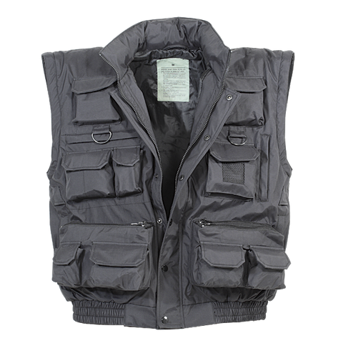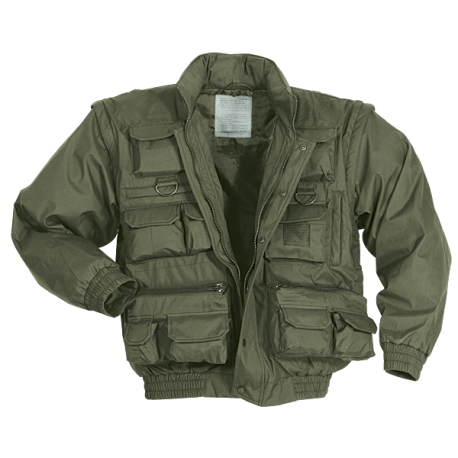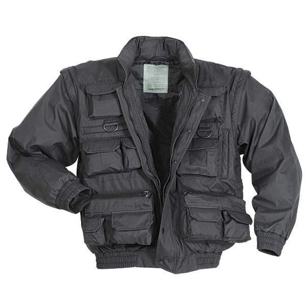 Made of breathable Gore-Tex style membrane fabric Features concealable hood in zippered collar, zip-off sleeves to convert to a vest, concealed right and left handed pistol holsters, front and rear "D" ring attachment points, 20 assorted pockets with zipper or hook-n-loop closure and full front covered zipper with snap closure Jacket folds into the rear zippered pouch.