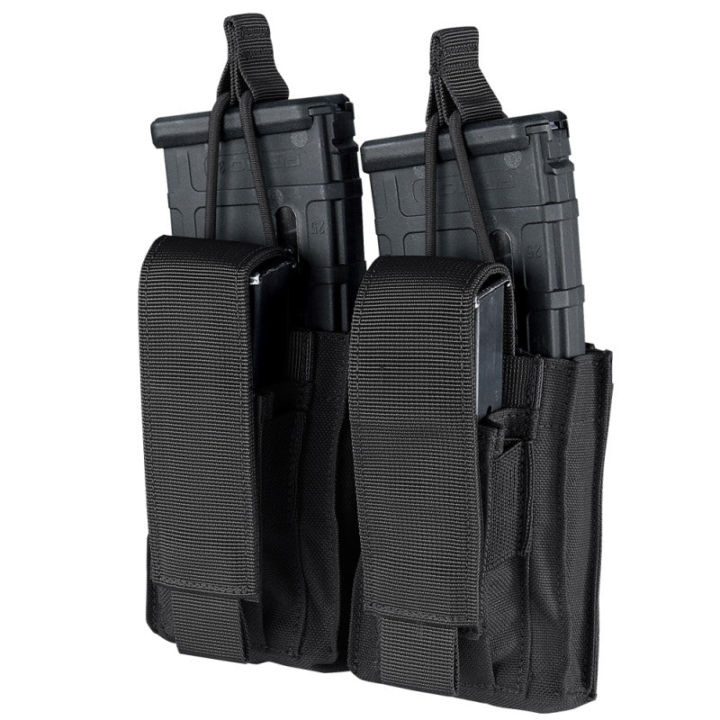 The DOUBLE KANGAROO MAG POUCH GEN II revolutionizes ammunition carrying solutions, offering space for two AR/M4 mags and two pistol mags. Its open-top design for AR/M4 magazines and adjustable flap for pistol magazines combine quick access with security, ensuring your ammunition is ready when you are. The bungee cord retention is adjustable, providing a custom fit for each magazine.